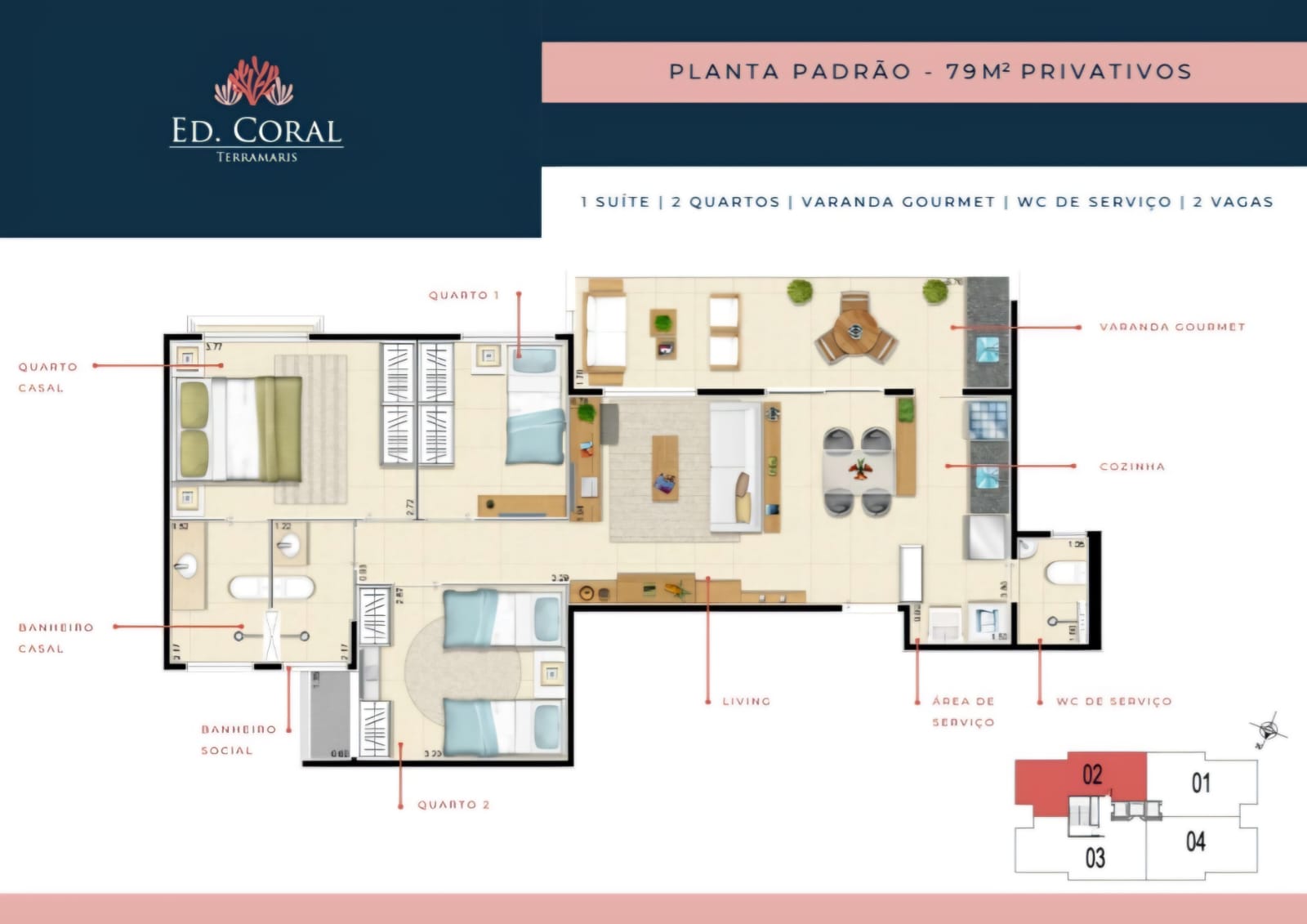 O apartamento no bairro Ponta Negra tem 79 metros quadrados com 3 quartos sendo 1 suite e 2 banheiros