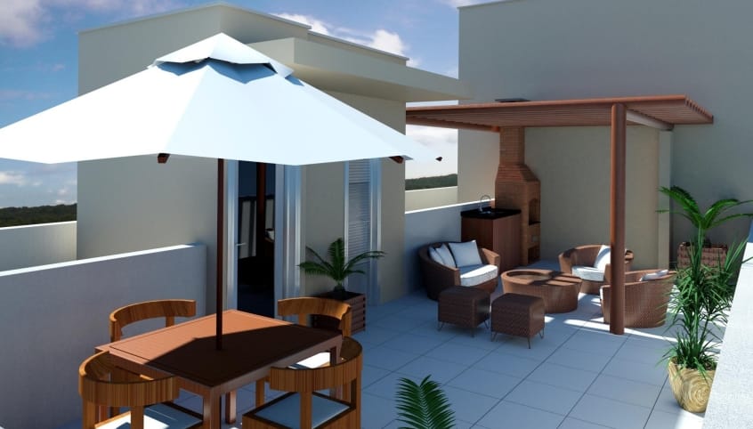 * Apartamento duplex- com sala de estar e jantar, cozinha, área de serviço, 2 quartos, sendo uma suíte, 2 banheiros sociais, área superior descoberta e churrasqueira privativa, 2 vagas de garagem.