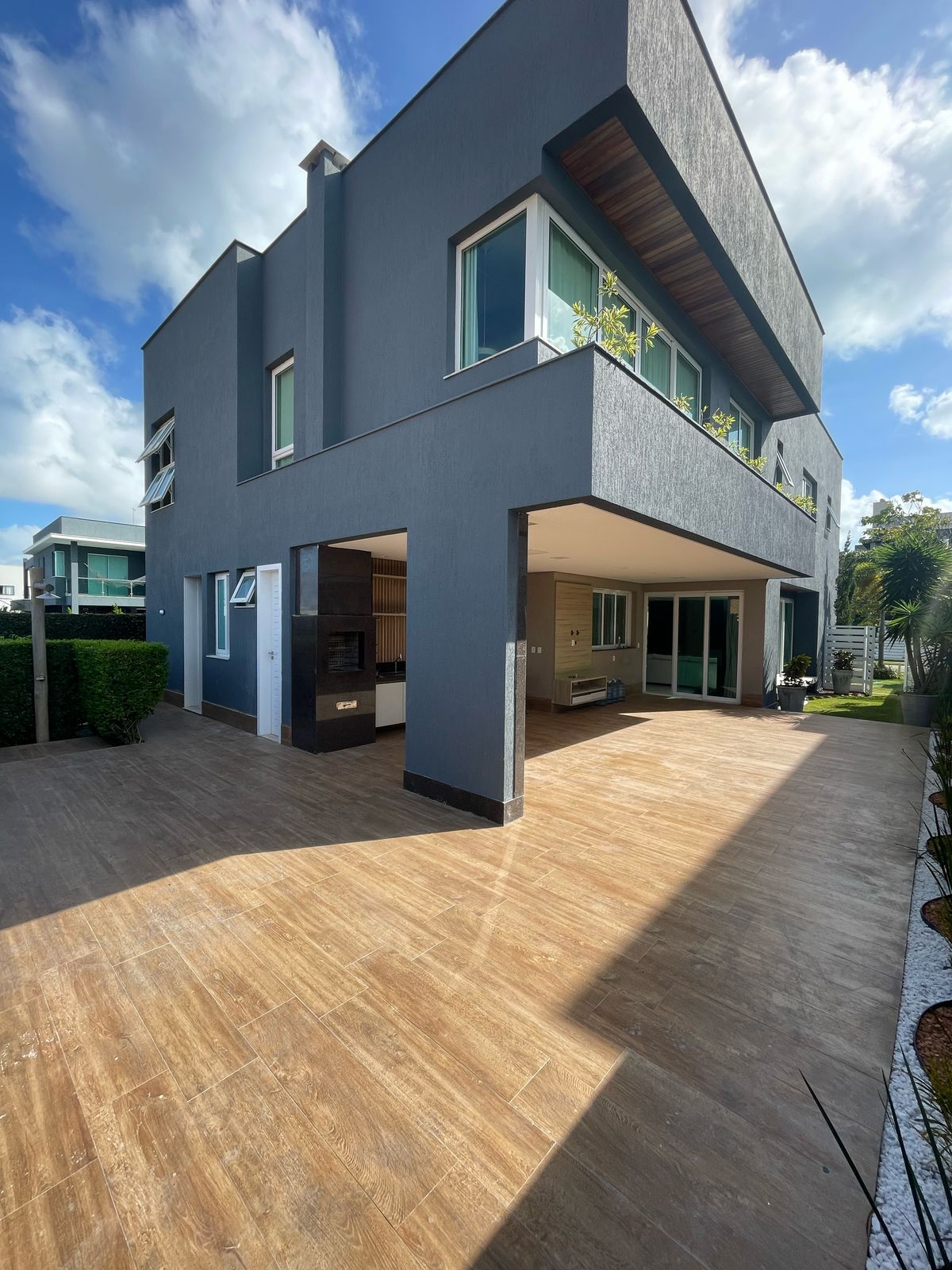 Encontra-se em um condomínio protegido por muros.