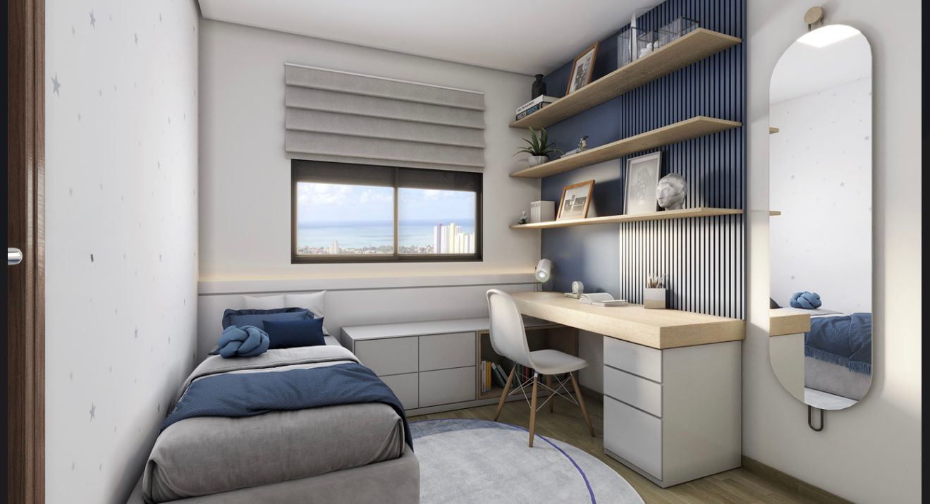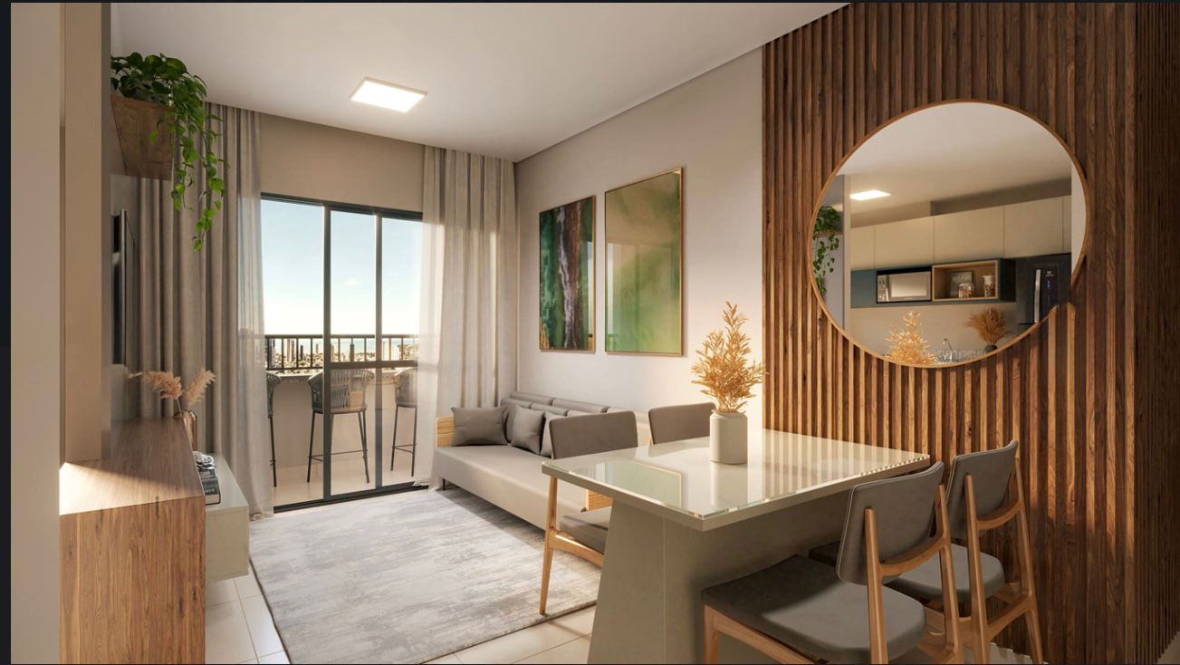 O apartamento conta com dois quartos sendo uma suíte, um banheiro social, varanda ampla e ventilada, área de serviço, sala de estar e cozinha.